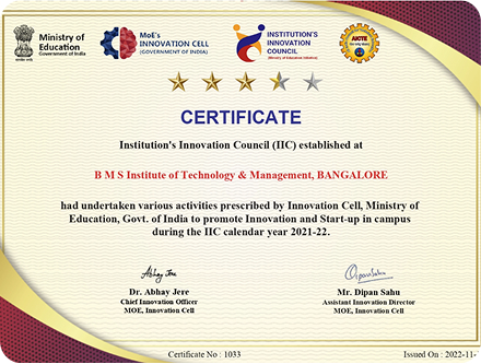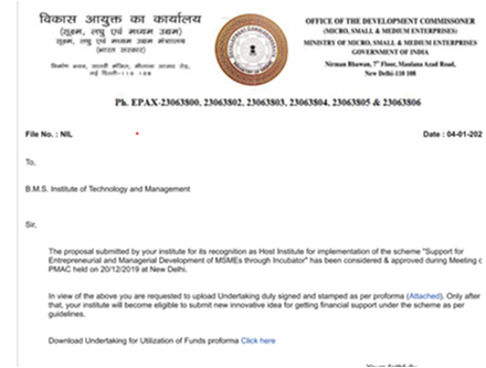 BMSIT&M established BICEP - BMS Innovation Centre and Entrepreneurship Park - Incubation centre to encourage students and faculties to catalyze development of innovation-driven enterprises. The Centre has been recognized and approved as the Host Institute to setup Business Incubator (BI) by Ministry of MSME, Govt. of India. The Incubation centre, activity engaged to enable its students get first-hand experience in entrepreneurship, promote innovation at the institute and provide comprehensive and integrated range of support including space, mentoring, training programs, networking and an array of other benefits.