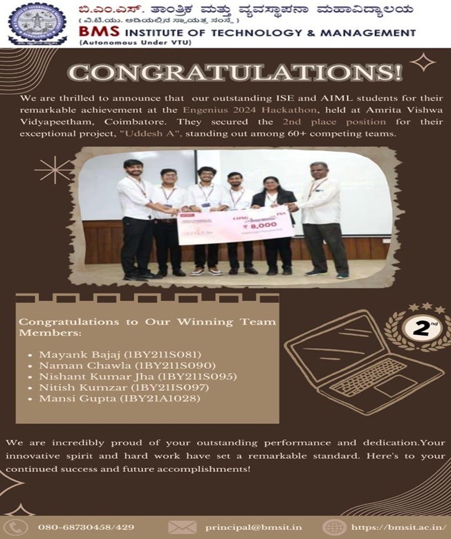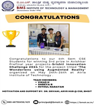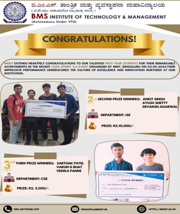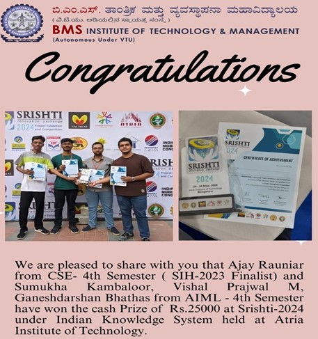The Department of Computer Science & Engineering at BMSIT&M nurtures a vibrant culture of undergraduate research, innovation, and entrepreneurship, encouraging students to design and develop technology-driven solutions for real-world problems. With strong mentoring from faculty members, students have demonstrated excellence in national-level hackathons, coding competitions, research forums, and innovation challenges. The department has consistently secured funding and support from KSCST, VTU, industry collaborators, startups, and government agencies for student projects and research initiatives. Students and faculty have received accolades including best paper awards, innovation awards, and recognitions for technical excellence. Projects span diverse areas such as AI and ML applications, smart cities, cybersecurity, healthcare informatics, fintech solutions, sustainable computing, and assistive technologies. The department maintains a strong publication record in reputed journals and conferences and has received funded project support from agencies such as SERB, DST, and industry partners. This strong emphasis on research, innovation, and applied learning positions the CSE department as a hub for cutting-edge computing education and impactful technological advancement.