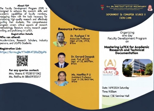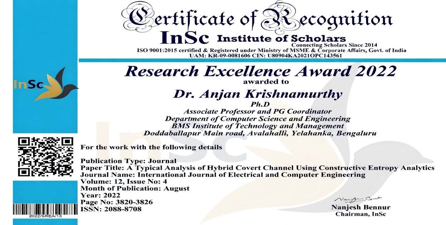 The Research Centre at the Department of Computer Science & Engineering, BMSIT&M, was established in 2014 under Visvesvaraya Technological University (VTU) with the objective of promoting advanced research and innovation in core and emerging areas of computing. Since its inception, the centre has actively contributed to quality research in domains such as artificial intelligence and machine learning, data science, cloud and edge computing, cybersecurity, Internet of Things (IoT), computer vision, natural language processing, blockchain, and software engineering. Supported by a team of experienced and research-active supervisors, the centre hosts both part-time and full-time Ph.D. scholars working on interdisciplinary and application-oriented topics including smart healthcare systems, intelligent transportation solutions, predictive analytics, secure communication systems, and AI-driven solutions for societal challenges. The research outcomes are focused on addressing real-world problems in technology, industry, governance, and sustainability.