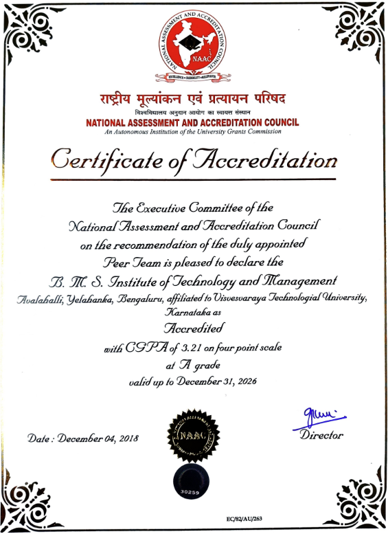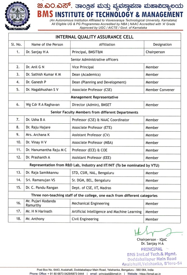 In pursuance of the action plan to monitor the attainment of Vision and Mission of the Institute, the National Assessment & Accreditation Council proposes that every Institution establish an Internal Quality Assurance Cell (IQAC) as a quality sustenance measure. Since quality enhancement is a continuous process, the IQAC will become a part of an institution's system and works towards realizing the goals of quality enhancement and sustenance. The prime task of the IQAC in BMSIT&M is to develop a system for conscious, consistent and catalytic improvement in the performance of various departments in the Institute. The IQAC will make a significant and meaningful contribution to channelize and systematize the efforts and measures of BMSIT&M towards academic excellence.